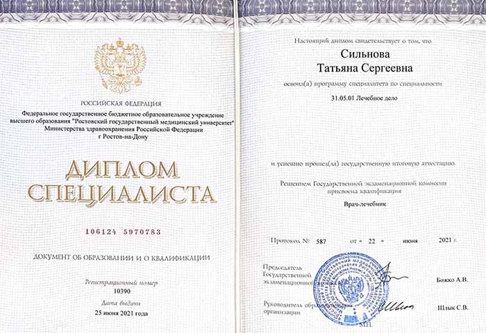 • 2021 г. – Базовое образование: Ростовский государственный медицинский университет (Лечебное дело);