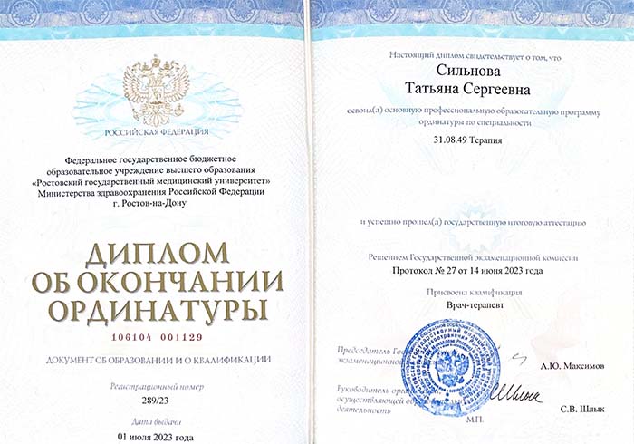 • 2023 г. – Ординатура: Ростовский государственный медицинский университет (Терапия).